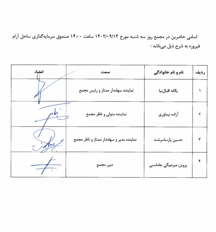 اسامی حاضرین در جلسه مجمع صندوق سرمایه گذاری ساحل آرام فیروزه مورخ ۱۴۰۲-۱۲-۲۲ساعت ۱۱ با موضوع افزودن هزینه كارمزد ثبت و نظارت سازمان بورس و اوراق بهادار