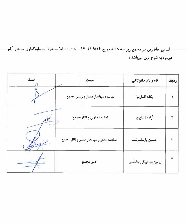 اسامی حاضرین در مجمع صندوق سرمایه گذاری ساحل آرام فیروزه مورخ ۱۴-۰۹-۱۴۰۲ ساعت ۱۴