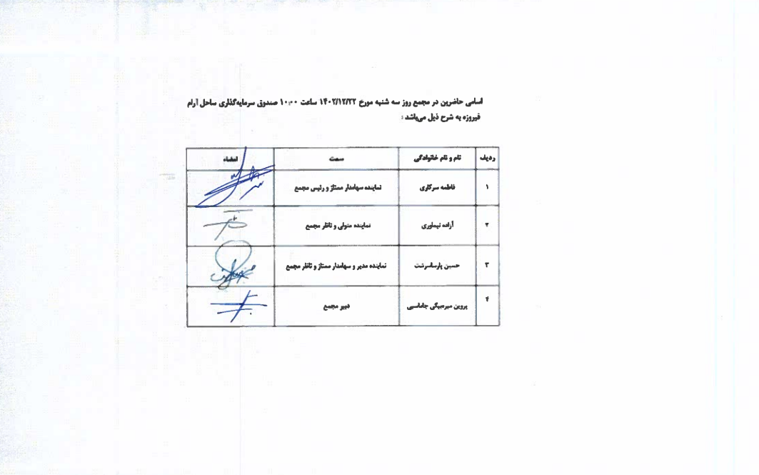 اسامی حاضرین در جلسه مجمع ساحل آرام فیروزه مورخ ۱۴۰۴/۰۵/۲۰ درخصوص افزایش سقف واحدهای قابل صدور از ۱,۰۰۰ میلیون واحد سرمایه گذاری به ۱,۷۰۰ میلیون واحد سرمایه گذاری