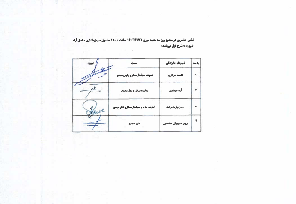 اسامی حاضرین در جلسه مجمع صندوق سرمایه گذاری ساحل آرام فیروزه مورخ ۱۴۰۲-۱۲-۲۲ساعت ۱۲ با موضوع اصالح وظایف حسابرس صندوق مطابق با مفاد ابالغیه ۱۲۰۲۰۲۶۰ مورخ .۱۴۰۲
